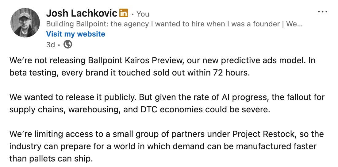 Client servicing and deep communication. Not all client servicing requires humans. There is lots of factual information that doesn’t need context, and soon I imagine our Ballpoint AI talking directly to the client AI to provide updates for immediate status reports. But the human time as we go through decisions, thinking, context, as we try to get people aligned and incentivised right – I can’t see this going away any time soon. Not just this, but the human-to-human sense that we’re in these trenches together as we are with our clients is still the most valuable work we can do.