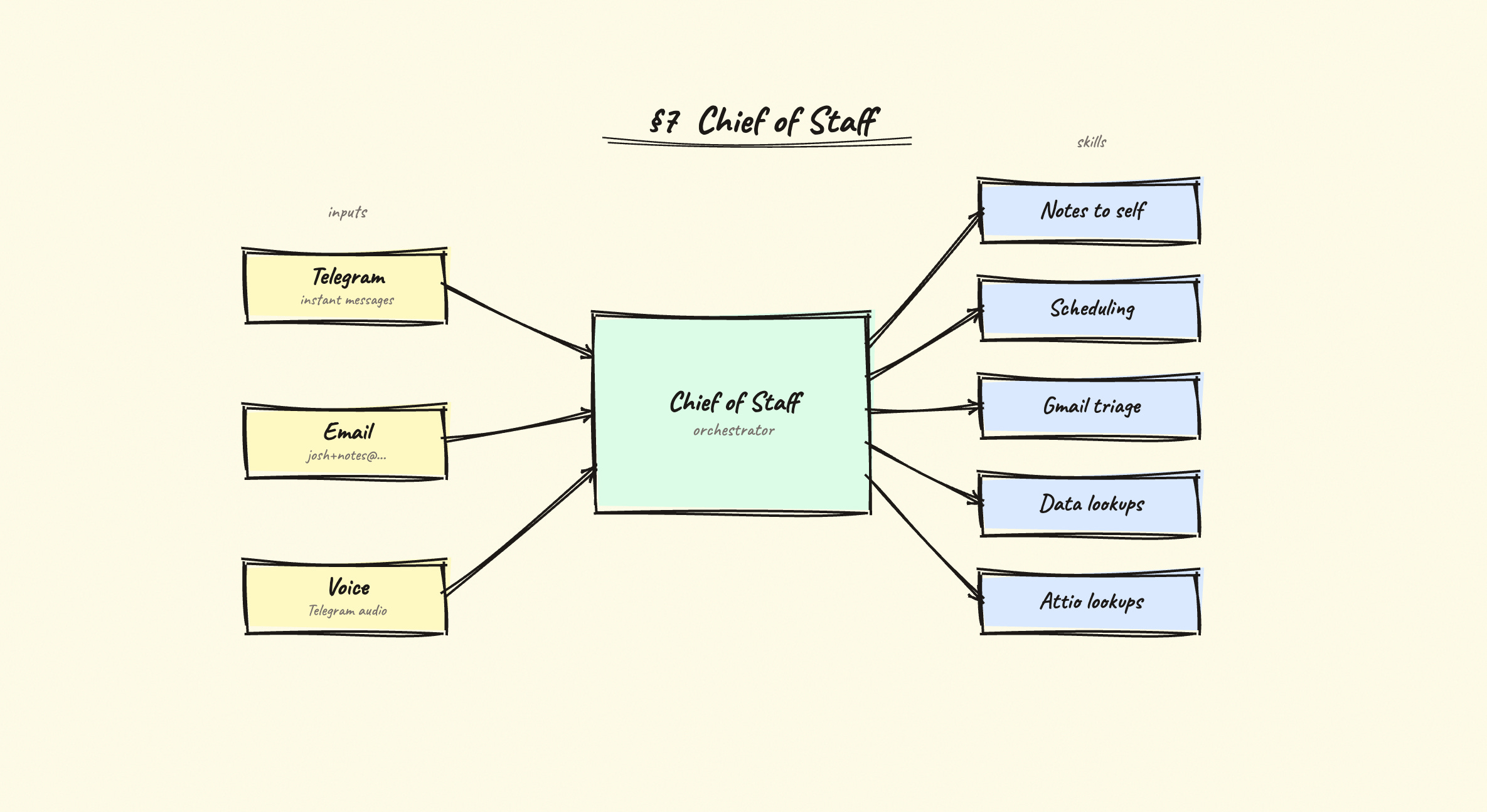 So I built a chief of staff. It ingests from a few places — Telegram API, an email subfolder (`josh+x@weareballpoint.com` goes straight in), voice notes. Whatever I share, it reads: if it’s a YouTube link, it pulls the transcript; if it’s an article, it reads the article. It’s logged into The Economist, FT, and The New Yorker, so paywalled pieces work too.