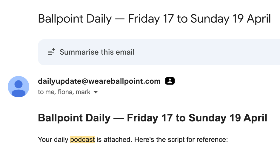I listen to it on the way into work. As the company has scaled, there’s a lot I’d miss otherwise. This bite-sized brief is how I stay close to the detail without being in every room.