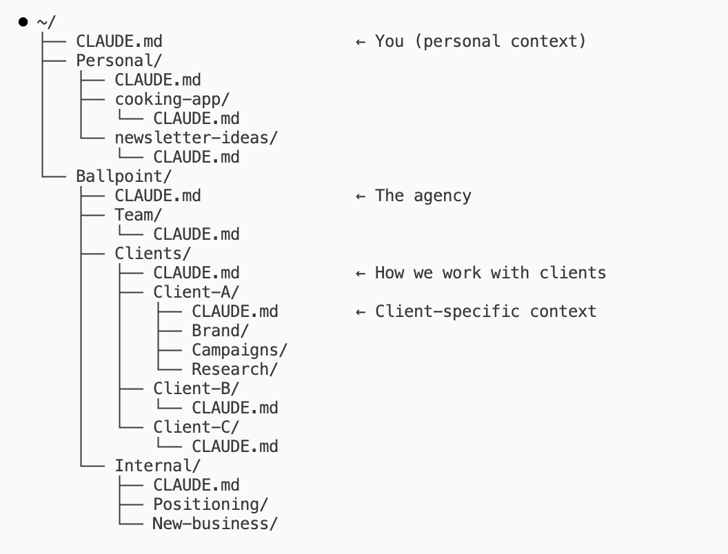 Inside Ballpoint, a Clients folder with a CLAUDE.md that contains key client info: systems for how we structure accounts, Notion organisations and so on.