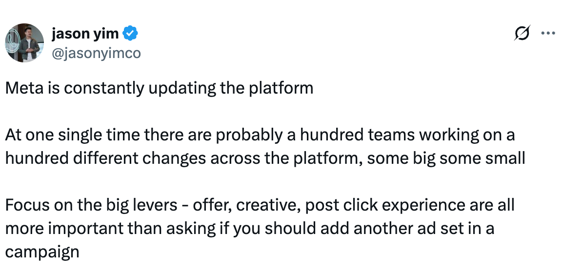 One of Meta’s solutions managers reiterated this this week: offer, creative, post click. These are the things that move the needle.