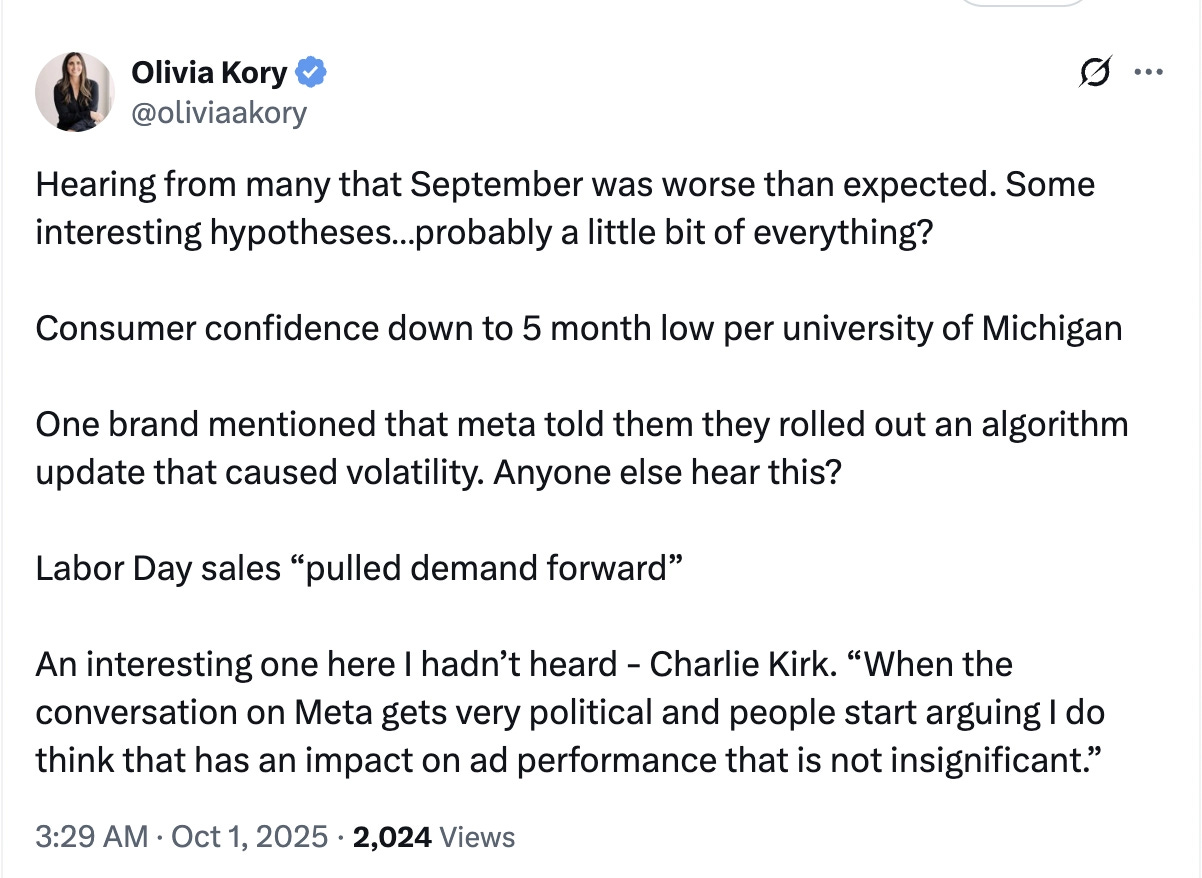 Off the back of this, I had five separate founders/CMOs DM each with brands spending between £200k and £2m/month who all flagged they were seeing terrible Septembers.